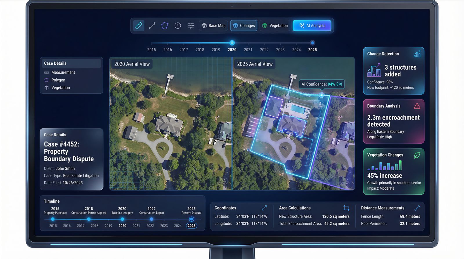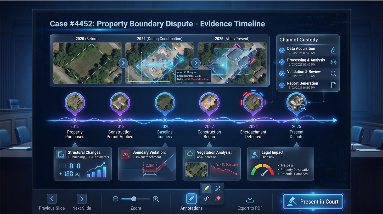 Boundary Verification Resolve property disputes with precision Construction Timeline Verify project progress for contract disputes Environmental Impact Assess compliance for development projects Due Diligence Support Comprehensive property analysis for transactions